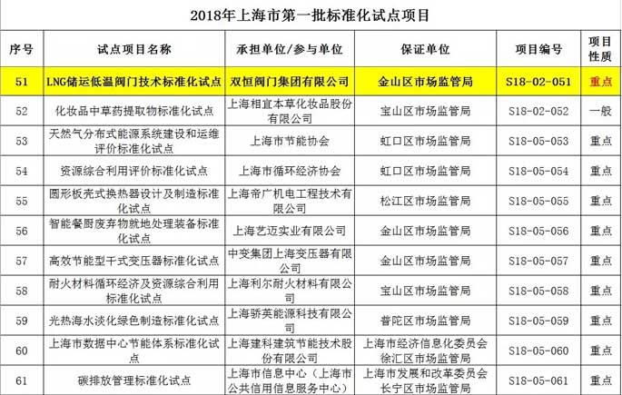 喜讯??!我司《LNG储运低温阀门技术标准化试点》被列为上海市第一批标准化试点重点项目!我司自成立以来,紧紧围绕着科研创新和技术进步推动企业发展,积极探索发挥标准化作用的路径和方法,建立科学、适用、协调的标准体系,积极参与国际、国内标准化活动,不断提升企业研发水平以及管理服务水平。我司于2014年引进了国内先进的“超低温深冷试验装置”,并先后研发了32项国家专利产品,其中,于2016年研发出“LNG超低温特种阀”并申请了发明专利。我司还先后与中科院、华东理工大学建立了“产、学、研”基地,与中国空气动力发展研究中心、中船重工某研究所、大连石油化工设计院、合肥通用机械研究院等科研单位建立了广泛的研发合作,并先后参加了“全国煤化工阀门国家标准”、“低温船用阀门国际标准”、“低温阀门国家标准”等多项国内外阀门标准的制定,对推动阀门行业标准化做了大量的贡献,获得广泛赞誉。